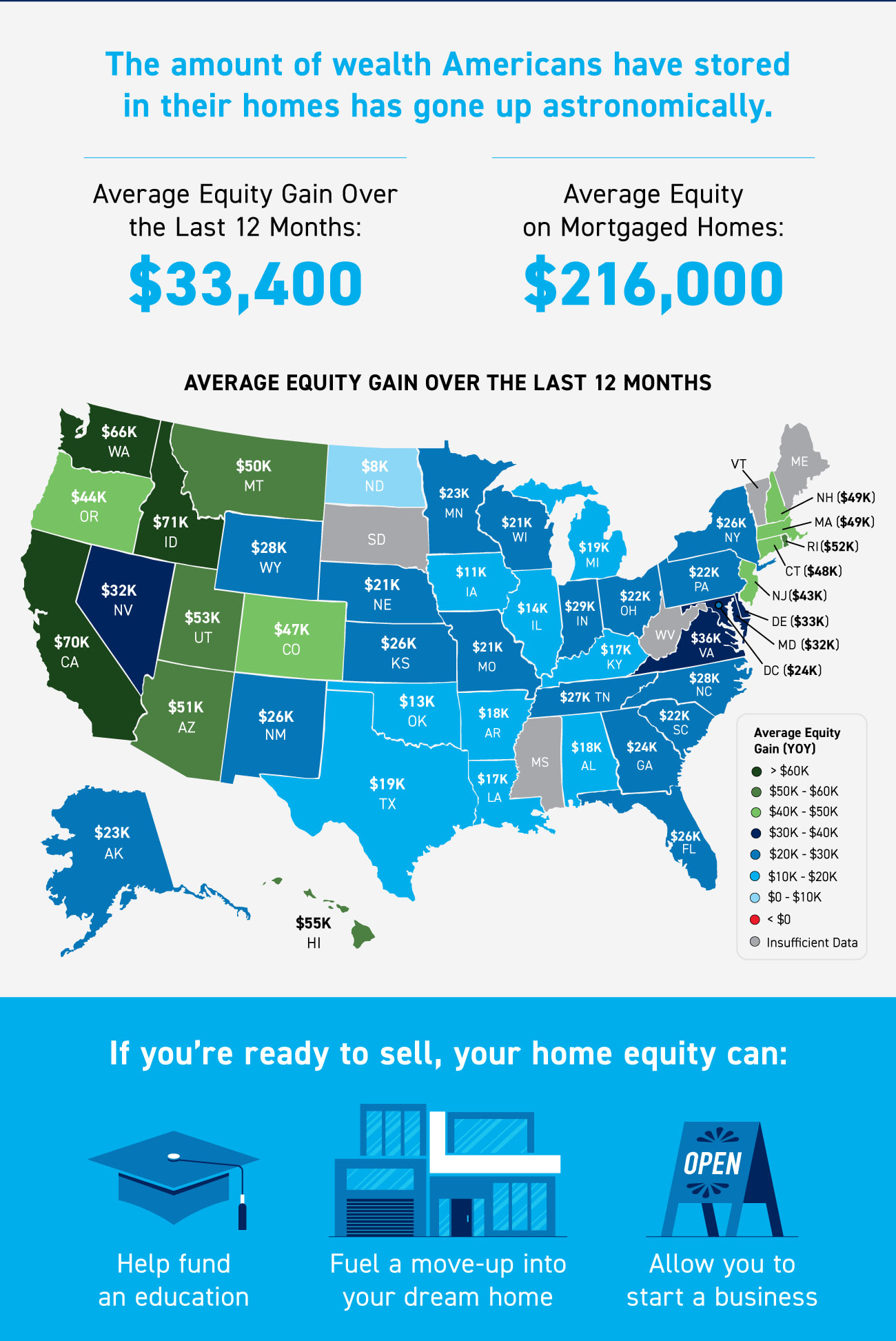 - On average, homeowners gained $33,400 in equity over the last 12 months, and the average equity on mortgaged homes is now $216,000.
